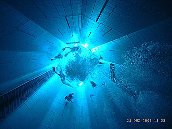 Das Becken ist in unterschiedlich tiefe Bereiche gegliedert: Stehtiefe, 3 m, 5 m, 10 m – und dann natürlich der 33 m tiefe runde Schacht mit etwa 5 m Durchmesser. Nicht nur wegen des üblichen Tauchgangsprofils erwies es sich als gute Idee, möglichst frühzeitig in den Schacht abzutauchen, denn nach 20 Minuten sah man dort vor lauter Luftblasen der zahlreichen anderen Taucher kaum noch etwas. Doch wir konnten die besondere Erfahrung des Tauchens in einem so tiefen „Schwimmbecken“ relativ ungestört genießen.