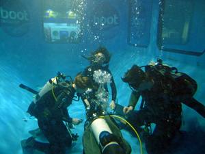 Heute konnten wir einen Scooter mit ins Wasser nehmen. Wenn man einmal die Beherrschung darüber gewonnen hat macht dass echt Spaß! Sich ziehen lassen ist auch mal ganz cool, auch wenn das Geräusch auf Dauer, vor allem wenn andere damit schwimmen, nervig ist. Vor allem in einem 4mx4mx8m großen Tauchturm. Der Scooter hat aber nicht nur mir Spaß gemacht, sondern auch die drei Jungen, vor der Scheibe, waren begeistert und wollten erst gehen, als wir mit dem Scooter das Wasser verlassen hatten.