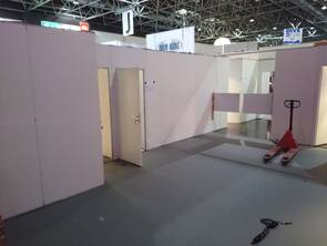 Zuerst mal die Folie von den Böden entfernen, dann die Möbel einrichten. Mist, die Steckdosen für den Kühlschrank funktionieren noch nicht. Wo hin mit den Esswaren? Zum Glück ist die Halle heute ja noch nicht geheizt. Da wird dann auch nichts so schnell schlecht. Aber wir müssen aufpassen, dass wir uns nicht erkälten. Also wird mit dicker Jacke und mit Mütze gearbeitet.