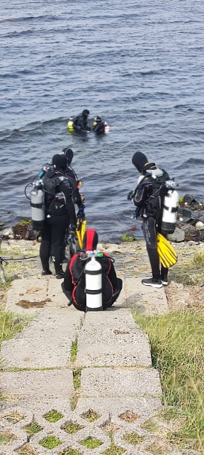 Der Einstieg des Tauchplatzes ließ sich nur über einen Deich durch hohes Gras, Büsche und Steine via einen Feldweg erreichen. Nach dem Briefing wurde aufgerödelt und ins Wasser gegangen. Zuerst musste man einige Meter aufs offene Meer hinaus tauchen, da die Küste recht flach war. Als der Hang, welcher sich Unterwasser befand, erreicht war, konnte endlich auf Tiefe gegangen werden. 18 Meter, 20 Minuten lang Pro Bahn wurde am Hang entlang getaucht. Die Sicht war, für das was man bei den Meeren im Norden gewöhnt ist, äußerst gut. Der Boden war übersät mit kleinen Pflanzen und Austermuscheln. Zwischendrin fand man gelegentlich einen Hummer, Krebse und vor allem Quallen. Viele Quallen!! Dass waren wir aber mittlerweile gewöhnt. Nesselspuren blieben manchen von uns dafür dennoch nicht erspart. Als die Zeit um war, sind alle wieder mit einem Lächeln aufgetaucht.