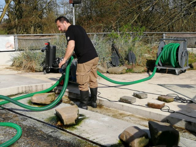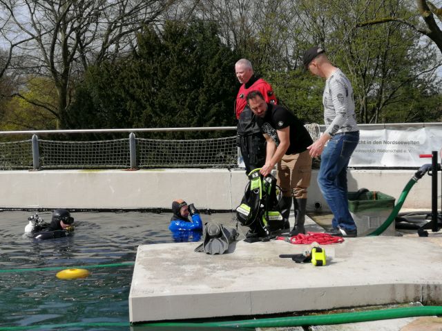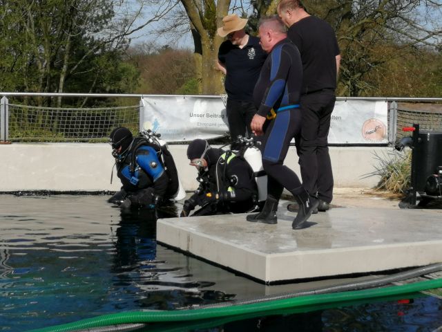 Die Unterwasserstaubsauger und sämtliches benötigte Material für die manuelle Reinigung wurden übrigens vom DUC Wattenscheid e. V. und dem Tierpark & Fossilium Bochum zur Verfügung gestellt. Ein Mitarbeiter des Tierparks und zwei Koordinatoren des DUC Wattenscheid waren während der Reinigungsaktion vor Ort. Sie wiesen unsere Taucher in den Umgang mit den Unterwassersaugern, sowie die Verhaltens-Regeln im Seehundbecken ein und kontrollierten das Reinigungs- und Filter-Equipment.
