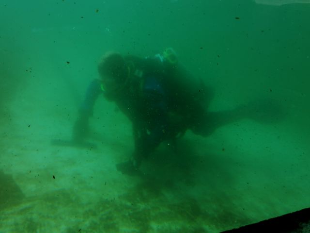 Christoph (Schriftführer) kam beim Fensterputzen unter Wasser als erstes ins Schwitzen. So anstrengend hatte er sich die Reinigung der Scheiben nicht vorgestellt. Mit einem Griff mit Saugnäpfen konnte er sich am Fenster fixieren und dann wurde gewienert was das Zeug hält. Währenddessen konnte Tony schon einmal mit dem Unterwasserstaubsauger (Ja so etwas gibt es wirklich!) den ersten Teil des Seehundbeckens von den Algen und abgesetzten Schwebeteilchen am Boden befreien.