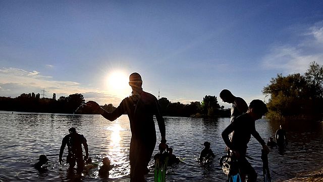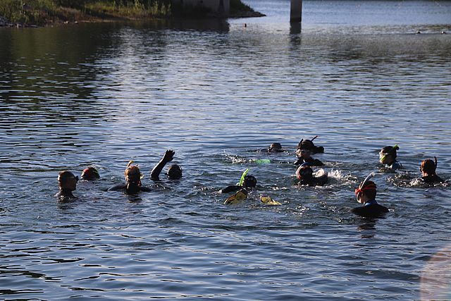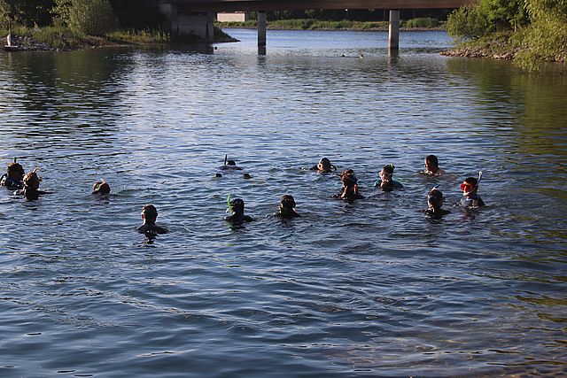Dann wurde es etwas gemütlicher, und der Teil des "Fische-Guckens" im Flachwasser begann, welcher etwa eine halbe Stunde dauerte. Dass den Kindern und Jugendlichen dabei nicht kalt wurde, lag natürlich einerseits an den sommerlichen Temperaturen und ihrem Neopren-Kälteschutz, aber sicher auch an den Unterwasser-Lebewesen, die die Ausbilder ihnen zu zeigen vermochten und für die sie großes Interesse zeigten. Darunter waren kleine Barsche und Rotfedern sowie Schnecken und Krebse. Diese waren sicher nicht so spektakulär wie in der Unterwasserwelt des Roten Meeres, aber dafür auch nicht so weit weg, nicht so teuer und ohne Flugzeug, sondern schnell auf dem kurzen Landweg erreichbar - und für die noch nicht so tauchverwöhnten Kinder und Jugendlichen sicher ein Highlight in ihrer beginnenden Taucherkarriere. Immerhin war da viel mehr zu sehen als nur die Kacheln des Nizzabades.