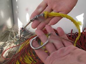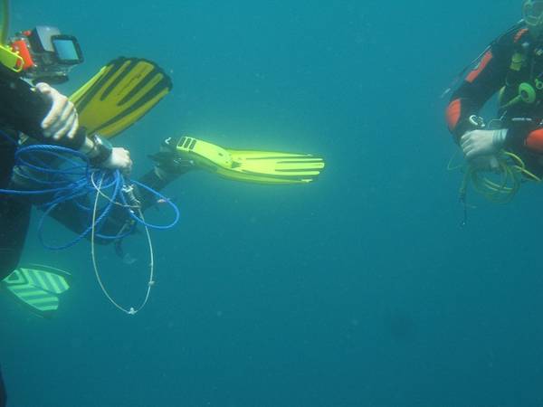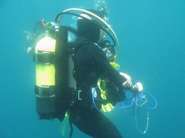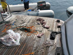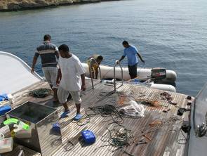 Unter Wasser sammelten wir einen Teil der ausgelegten Leinen ein. Endlich wissen wir warum Taucher ein Messer benötigen. Unsere Crew und die von 2 anderen Schiffen kümmerten sich um die Leinen die von der Oberfläche eingeholt werden konnten.