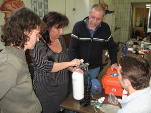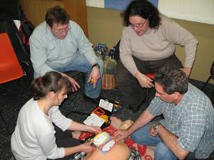Dann ging es so richtig zur Sache. Die Organisatoren Heiko, Anike, Olaf und Robert hatten für die praktischen Übungen zwei lebensgroße Puppen, mehrere Torsos, einen Sauerstoffkoffer, sowie ein AED (autom. elektrischer Defribrilator) als Simulationsgerät organisisiert. So konnten immer drei Teilnehmer gemeinsam an insgesamt fünf verschiedenen Station alles wichtige für den Ernstfall üben.
