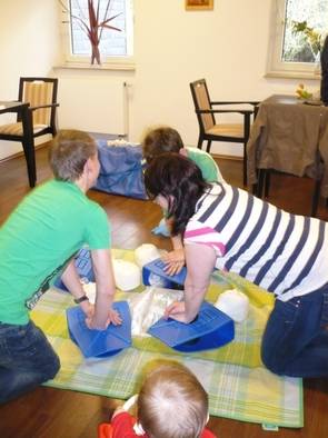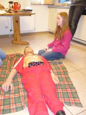 Außerdem wurde die stabile Seitenlage am lebenden Objekt trainiert, und die HLW an den Köpfen. Ein Komplettdurchlauf an der Puppe mit lebensnahen Situationsschilderungen seitens Olaf, in welcher misslichen Lage die Puppe sich befindet rundete den Kurs ab.