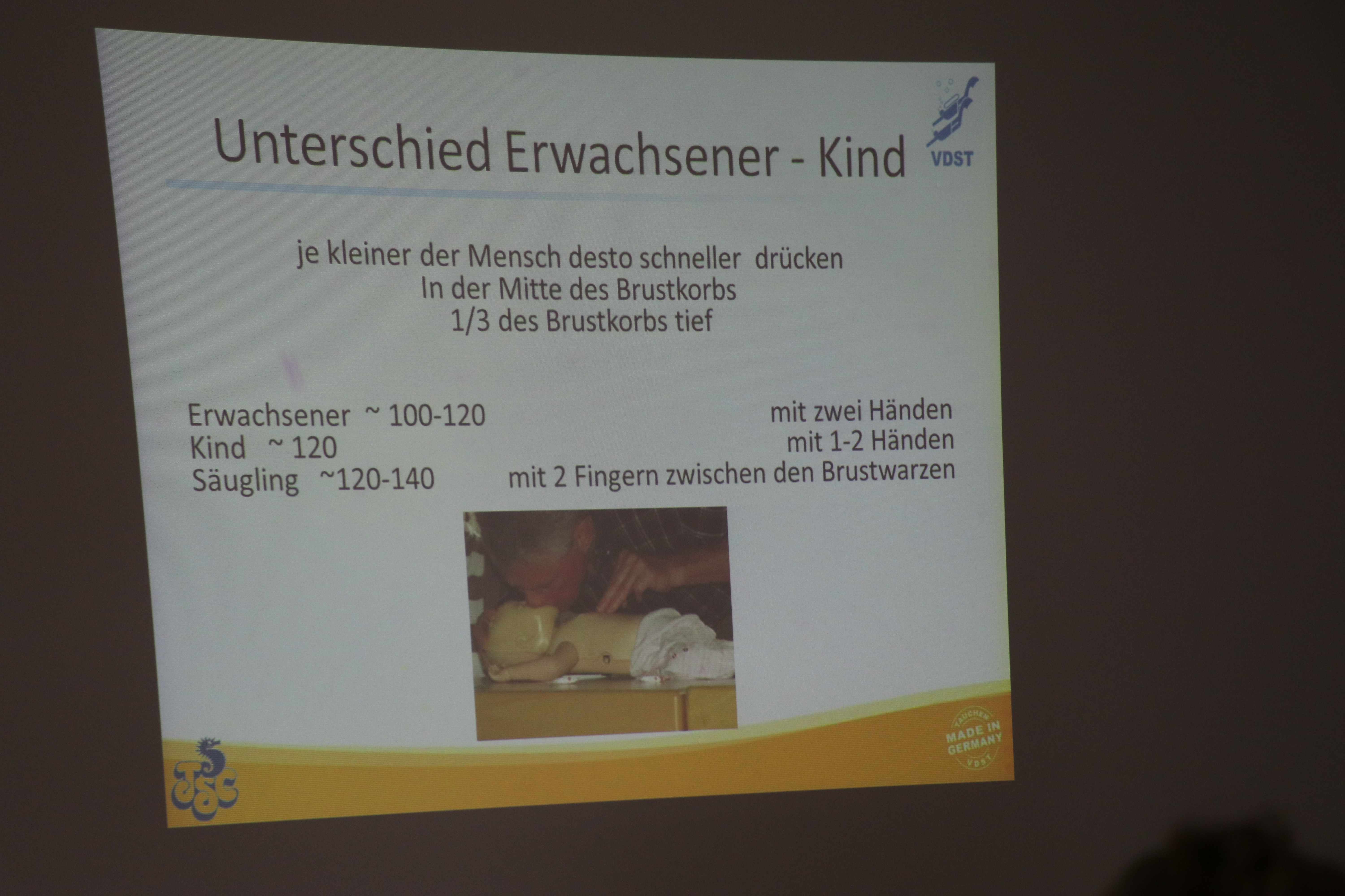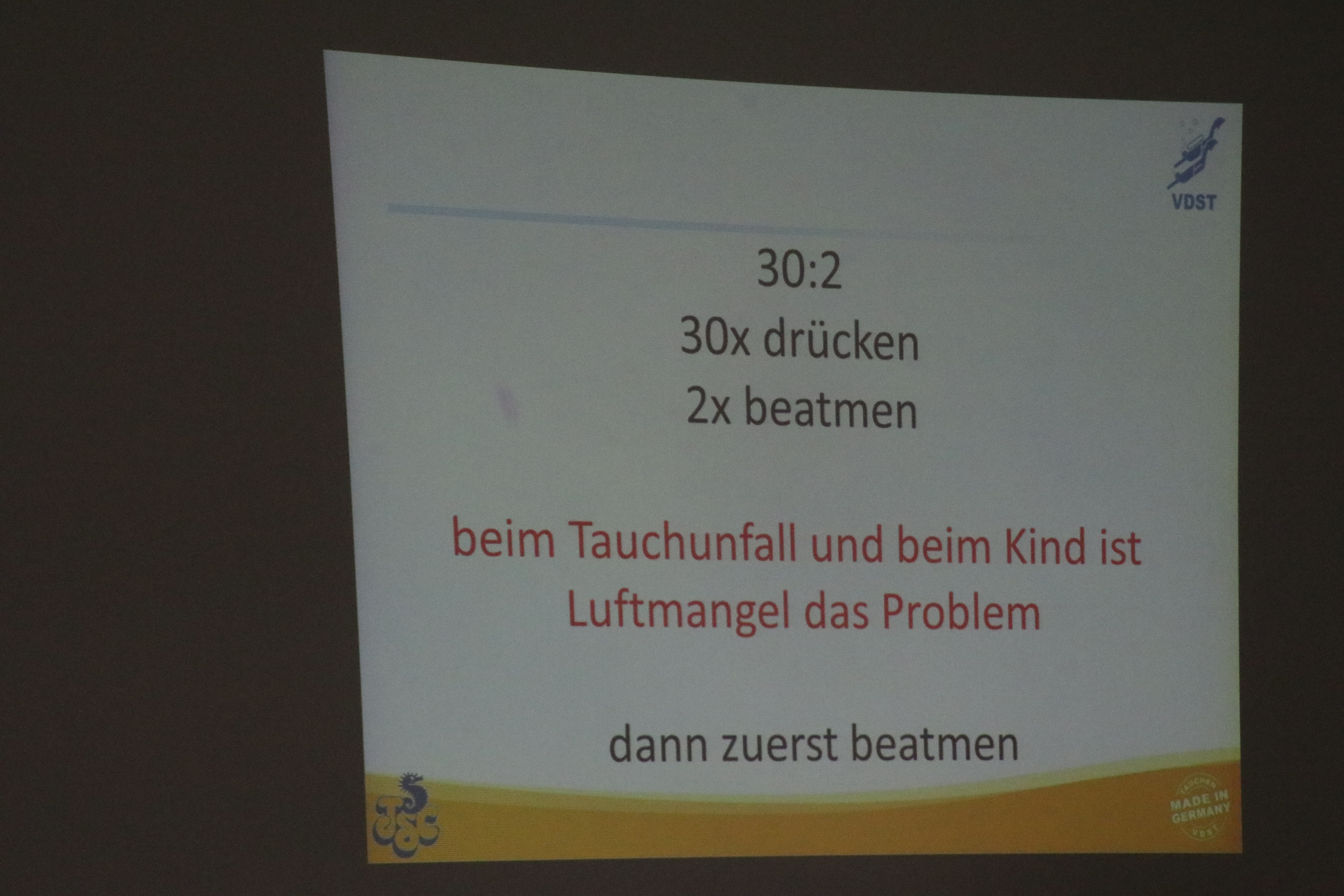 Im theoretischen Teil ging es um die sogenannte Rettungskette, d.h. die Absicherung des Unfallortes, den Notruf und die Sofortmaßnahmen, sowie weitere Erste Hilfe. In unserem Fall war das die Beatmung und die Herzdruckmassage und zwar solange bis medizinisches Fachpersonal übernimmt.