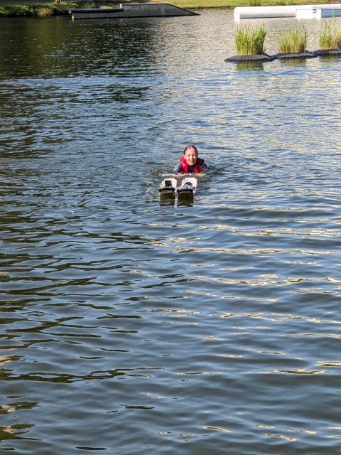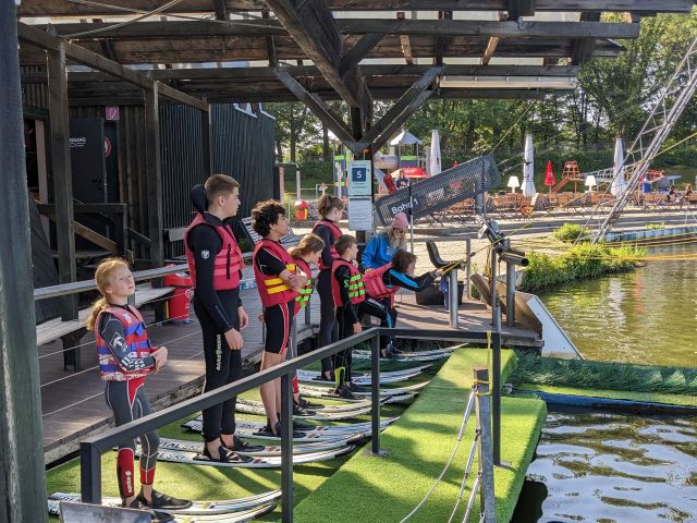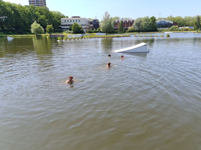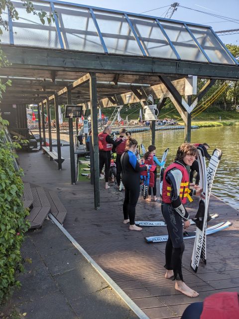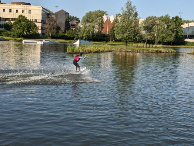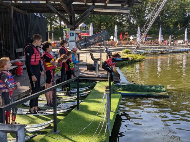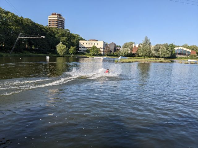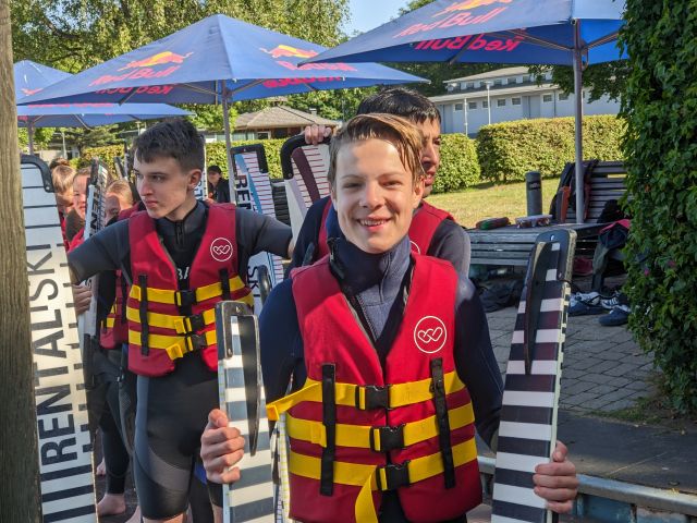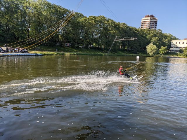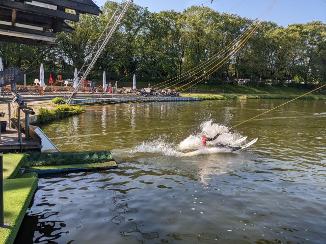Am nächsten Morgen war für uns ab 09:00 Uhr die Wasserski-Anlage reserviert. Wir trafen uns alle mehr oder weniger pünktlich zum Frühstück, haben es aber trotzdem pünktlich zur Wasserskianlage geschafft. Dort angekommen zogen wir uns nach einer kurzen Einweisung schnell um und nachdem Tony uns einmal Wasserski-fahren vorführte, hieß es für den Großteil von ein paar Meter wackelig zu fahren um dann ins angenehm warme Wasser zu fallen. Spätestens nach 3-4 Versuchen hatten die meisten jedoch den Dreh raus und fuhren ihre ersten Runden.