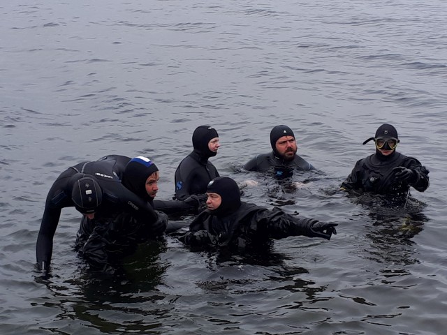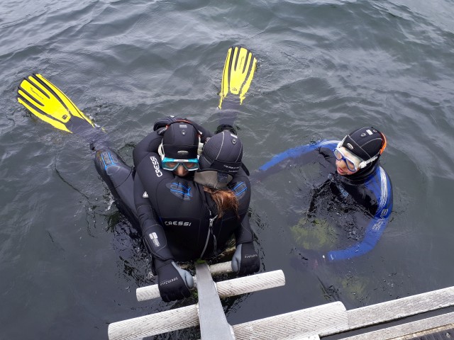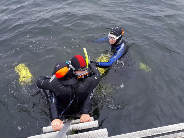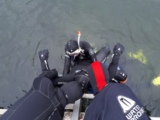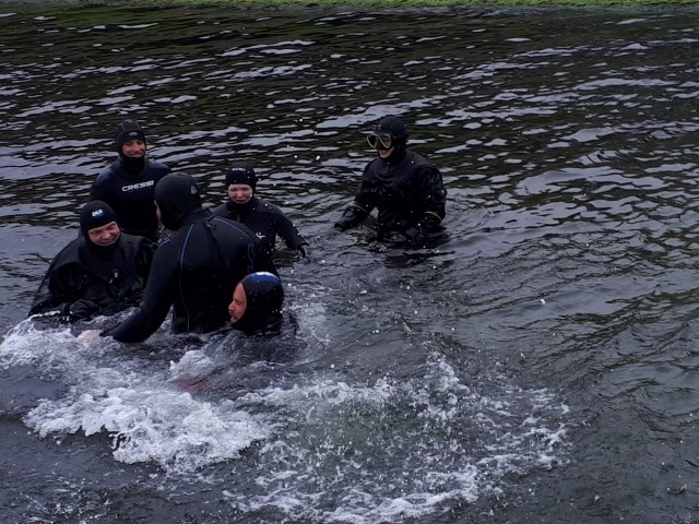 Wiederrum hatte das auch den Vorteil, dass am verhältnismäßig frühen Samstagmorgen besonders viele Taucher, zum Teil auch im Trocki, fit genug waren eine gemeinsame Rettungsübung in Den Osse durchzuführen. In zwei Gruppen aufgeteilt wurde die Rettung über die Taucherleiter und die Anwendung des Rautek-Trage-Griffes im Flachbereich geübt. Dabei wurde von den einzelnen Rettern auch mal ein größerer und ggf. schwerer Proband aus dem Wasser gerettet und sicher an Land gebracht.