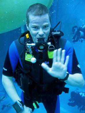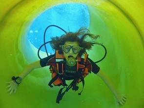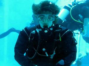 Auch den Vieren gelang es endlich sich durch die Masse zu kämpfen und ans Becken zu gelangen. Doch auch dort war kein Platz mehr, zum unterbringen ihrer Ausrüstung. Nach viel Stress und Durcheinander schafften sie es irgendwann, ihren ersten Tauchgang zu beginnen. Wie vorher am Beckenrand so auch unter Wasser war sehr wenig Platz. Man musste ständig aufpassen dass einem keine Flosse traf oder das man selbst jemanden die eigene Flosse um die Ohren schlug.