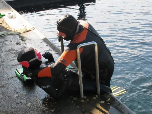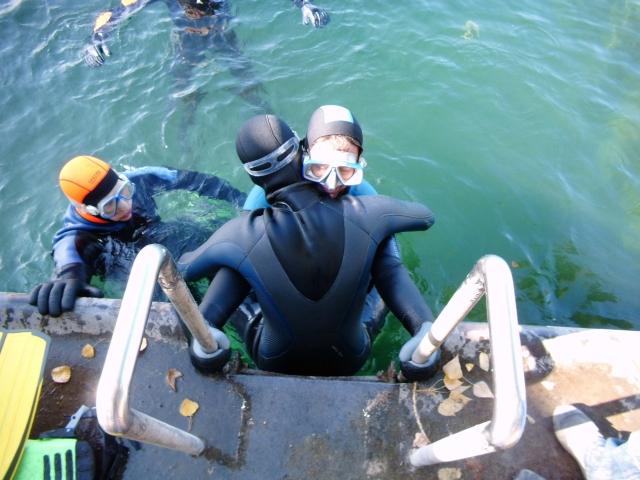Praktisch war es doch etwas chaotischer. So wurde schon vor dem Tauchgang die Kopfhaube zum Trocki vermisst. Glücklicher konnte auf den Nasstauchanzug mit Kapuze umgestiegen werden. Unter Wasser ging es dann mit realen Problemen, wie losen Flossen und zu viel Blei weiter, so dass der an Atemnot leidende und langsam das Bewusstsein verlierende Tauchlehrer schlichtweg übersehen wurde.
