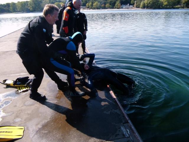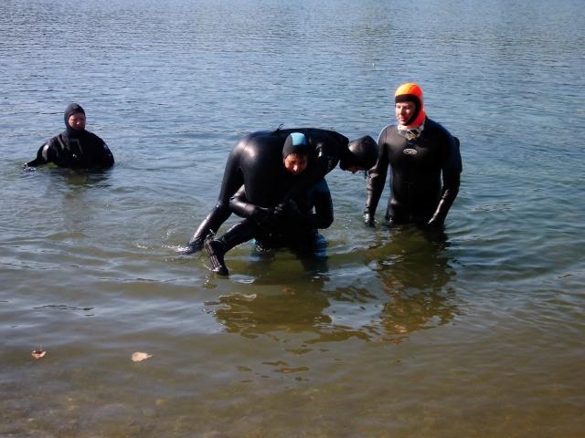 Nachdem wir so alles Theoretische verinnerlicht hatten, ging es zum See, um beim 1. Tauchgang zu zeigen, dass wir nun gute Helfer in der Not sind.