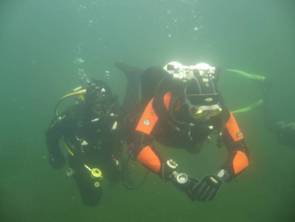 Dann ging es endlich ins Wasser. Schließlich hatten wir auch einen schönen und heißen Spätsommertag erwischt. Es wurden zwei Gruppen gebildet: Christian, Gaby und Olaf und Meike, Andreas und Dirk. Nachdem nach ein paar Minuten die Plattform auf 5 m gefunden war: Jacket lockern, dasselbe über Kopf etwas nach unten ziehen, dann nach hinten gegriffen und mit spitzen Fingern das Ventil abgedreht, auf den Oktopus gewechselt und wieder zurück. Na ja, da zeigt sich dann, dass es doch nicht sooo einfach ist. Aber machbar, wenn die Konfiguration der Ausrüstung stimmt.