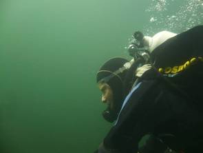 Was passiert eigentlich, wenn man Blei verliert? Ist schon doof, das schöne Blei ist futsch. Aber damit eben auch die Tarierung. Die Übung dazu ist: in der Waagerechten austarieren mit Zusatz-Blei auf dem Rücken. Dann wird es irgendwann ohne Vorwarnung weggenommen. Jetzt musste reagieren und schnell für eine neue Tarierung sorgen, ansonsten geht’s ab dafür.