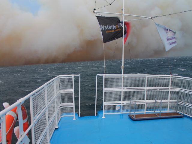 Losgefahren in Listwianka sind wir bei strahlendem Sonnenschein und fast 20 Grad. Aber in den folgenden Tagen war alles an Wetter dabei, was man sich vorstellen kann. Sonne, Regen, Sturm, Schnee, Eisregen. Das Schiff hatte eine Sauna an Bord und wir haben uns oft zum An- oder Ausziehen des Trockis in die Sauna verkrümelt, weil der Wind wirklich kalt an Deck gepfiffen hat.