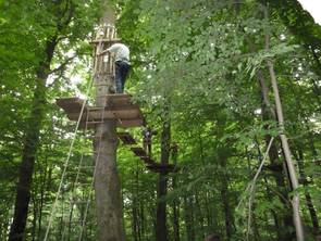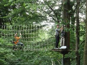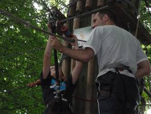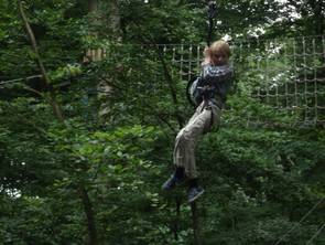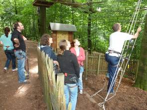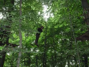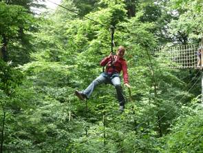 Wir waren 17 Teilnehmer, wenn ich mich nicht verzählt habe. Darunter Große, Kleine und ganz Kleine. Ganz klein, aber oho, war Marco mit 4 Jahren, der den Kinderparcour erfolgreich bewältigte, was am gefährlichsten für Papa Olaf war, weil die Sicherung für Ihn (ist ja einer von der großen Sorte) unterhalb der Hüfte lag. Aber auch er hat es überlebt. Übrigens: Kinderparcour hört sich harmlos an. Aber er geht ebenfalls bis in 8m Höhe hinauf und kann einem die Knie weich werden lassen.