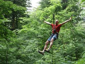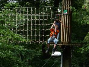 Vier Routen gibt es zu klettern, was ungefähr 2,5h dauert, wenn man nicht anstehen muss. Zuerst erfolgte aber die Einweisung in der Gruppe. An einer Strickleiter bis ca. 5m hoch, dann an einem ersten Stück entlang hangeln und schließlich mit einer kurzen Seilbahn zurück zum Boden. Auf diesem Teststück lernte man wie man sich zu sichern hatte, und ob man für den Job in luftiger Höhe überhaupt geeignet ist. Ich war es nicht:-(. Vielleicht das nächste mal, wenn ich wieder in besserer Körperverfassung bin. Die anderen haben es alle getan.