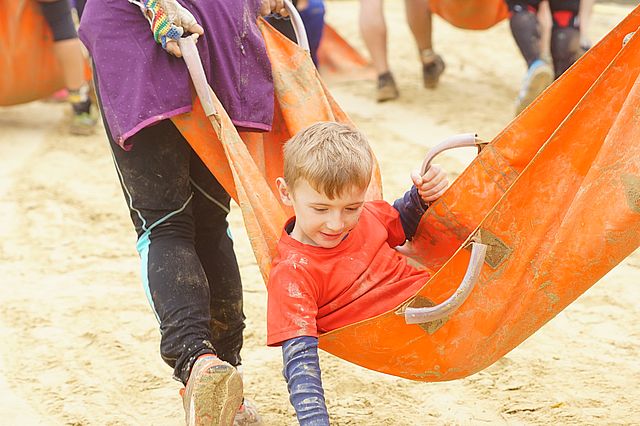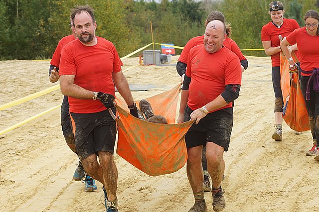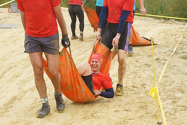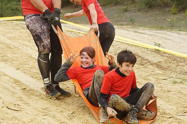 Das erste Hindernis erwartete uns direkt auf der Startlinie und so war klar, hier hilft jeder jedem. Es folgten Kästen, die zu überklettern waren, Berge die hinauf und hinab gelaufen (mehr rutschen als laufen) werden mussten, Sandkuhlen mit und ohne Wasser, Tunnel zum Kriechen, eine Hügelstrecke, Matschfelder mit Netz zum drunter her robben mit und ohne Strom sowie Reifen zum überklettern. Zusätzlich durfte Sackhüpfen und „Schubkarre fahren“ nicht fehlen. Auch Verletzte tragen und Huckepack laufen war mit im Angebot. Wir waren von oben bis unten mit Schlamm eingesuhlt, aber alle hatten ihren Spaß.
