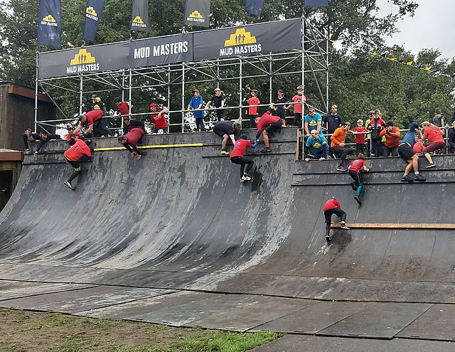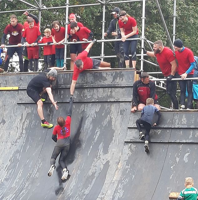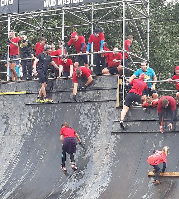 Das letzte Hindernis war auch das schwerste. Es konnte auch von den Großen nur mit gegenseitiger Hilfe bewältigt werden. Wir mussten eine gebogene und immer steiler werdende Wand herauflaufen/klettern. Wie auch immer. Die meisten scheiterten schon auf der Hälfte und purzelten kopfüber wieder herunter. Ohne helfende Hände von oben war es für die meisten einfach nicht zu schaffen. Es gab zwar eine leichtere Version für die Kids, aber uns hatte der Ehrgeiz und auch der Teamgeist gepackt. Und so konnten wir uns rühmen, gemeinsam auch das letzte Hindernis überwunden zu haben.