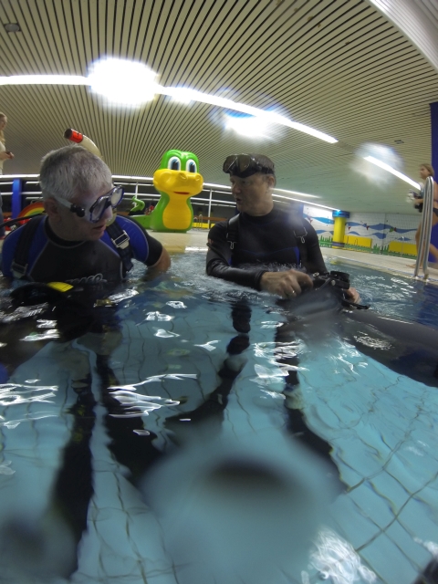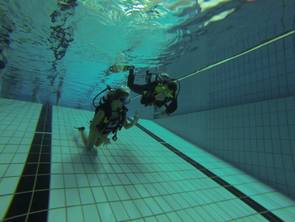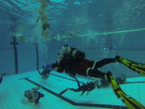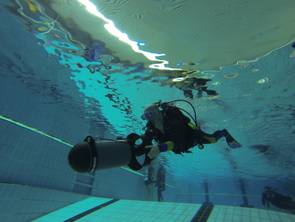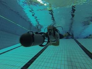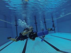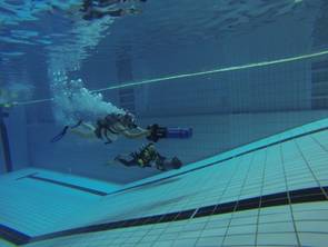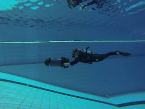 Unter dem besonderen Motto „Schnell, schnell, schnell“ hatten alle Teilnehmer die Möglichkeit einen der zwei vorhandenen Scooter zu nutzen und sich motorisiert durch das Schwimmbecken des Nizzabades ziehen zu lassen. Danke an Jörg und an die Tauchschule Luckydivers in Essen, dass ihr Eurer Material für diese tolle Möglichkeit zur Verfügung gestellt habt. Nach einer kurzen Einweisung durch Jörg ging dann die Post unter Wasser ab. Plötzlich wurde man von fliegenden Tauchern überholt.