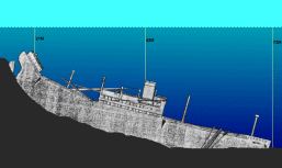 Ja und da saßen wir dann. Es war ruhiger als sonst auf dem Boot. Jeder auf sich konzentriert. Gerade noch ein: „Kannst Du mir mal den Gurt hier…“. Wir hatten mit Alex und dem Bootsführer ein eigenes Schlauchboot. Mit dem Sonar die Tiefenlinie erkundet….“ja, ist ein BISCHEN Strömung“, „nein, wir machen heute keine Übung, nur tauchen“, Anker geworfen (nur für die Boje. Das Boot war lose, um Abgetriebene aufzunehmen), (Junge, da geht aber viel Leine). Tja und dann über Bord. Treffen war auf 6m. Robbi und ich als erstes. Noch mal fuhr das Boot die Boje an, da bereits zu weit abgetrieben. Dann sah man Alex und Christoph über Bord fallen. Sammeln auf 6m, Check ob Blasen austreten. Alles dicht. Und dann ab. Aber zügig. Geht alles von der Grundzeit ab.